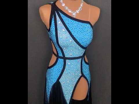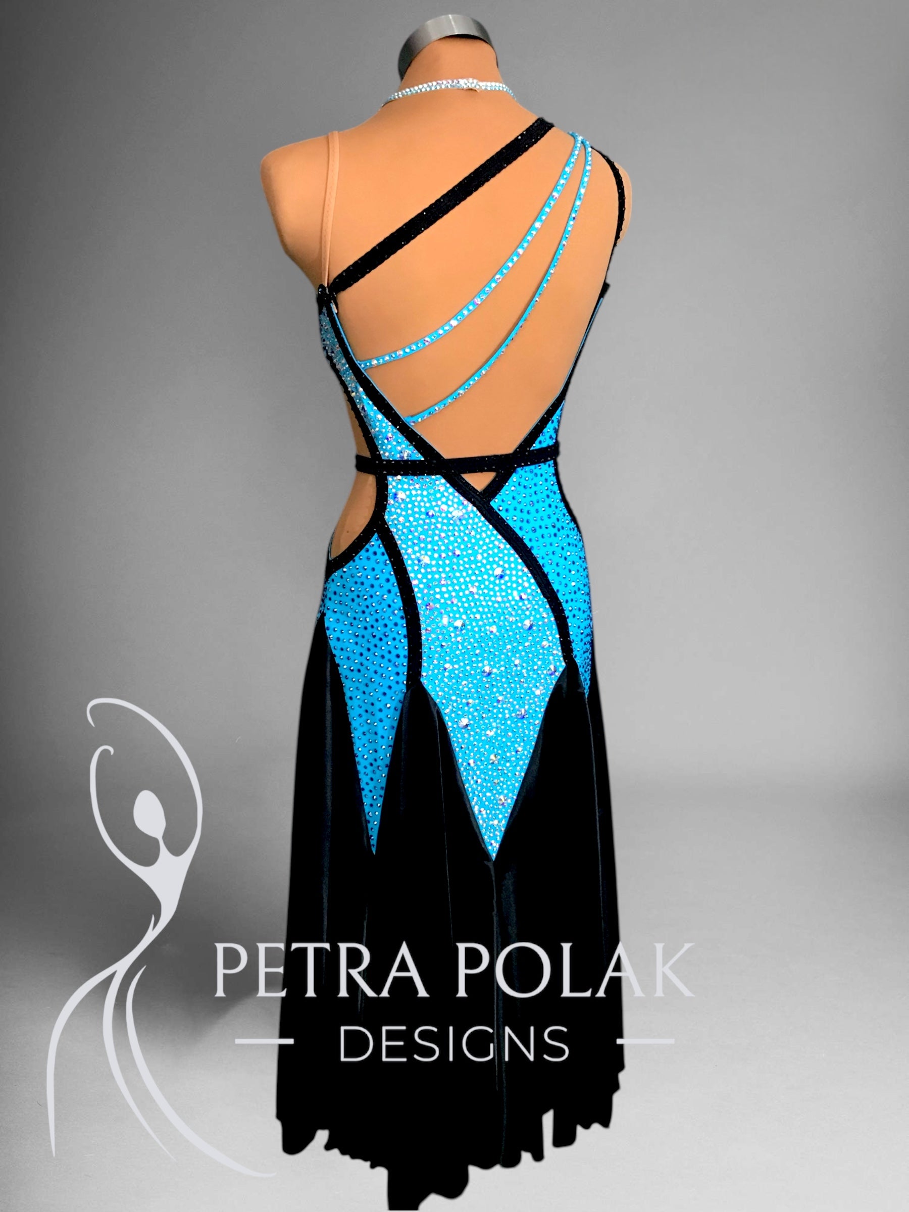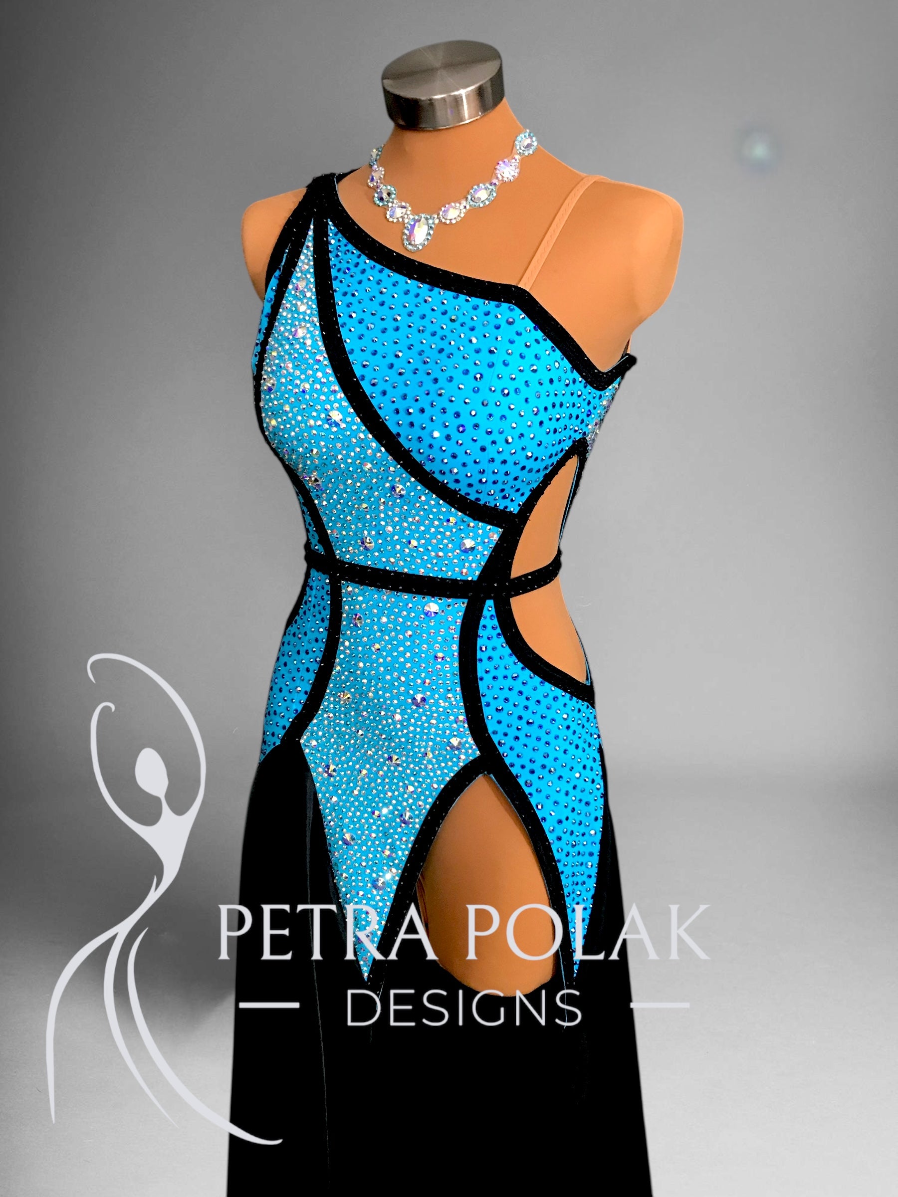This striking Smooth dance dress is crafted from supple stretch lycra and luxurious satin. The bodice features bold black geometric stripes that create a dramatic contrast, while a gradient of blue tones is artfully placed throughout to deliver captivating shine and visual depth.