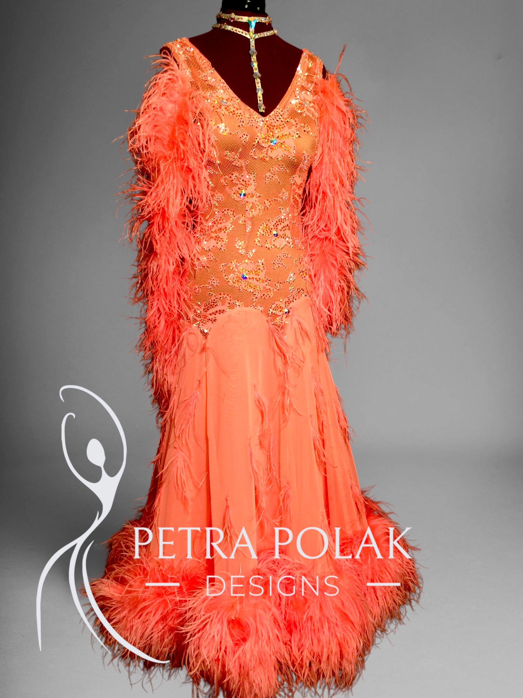 The flowing skirt features two layers of soft georgette for beautiful movement, finished with a luxurious ostrich feather boa along the hemline. Additional feather clusters are placed strategically on the skirt and along the arms, enhancing fluidity and adding graceful motion with every turn.