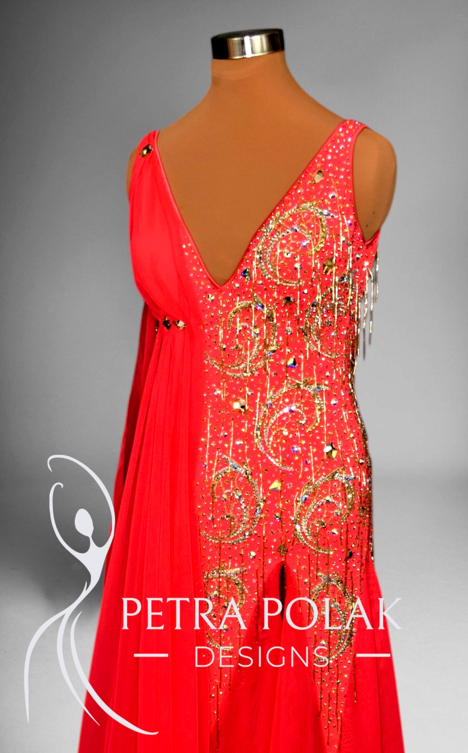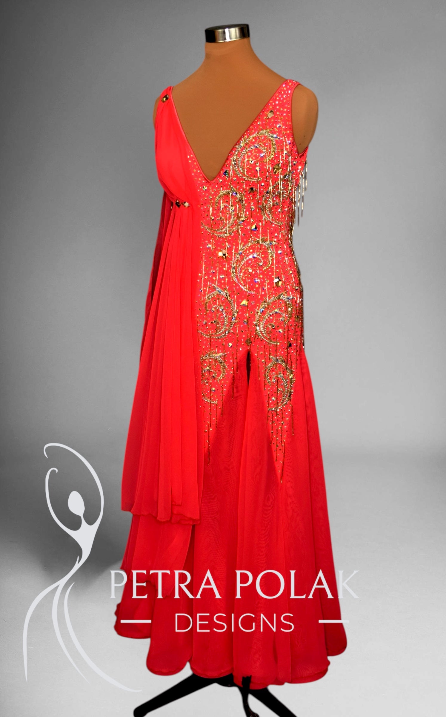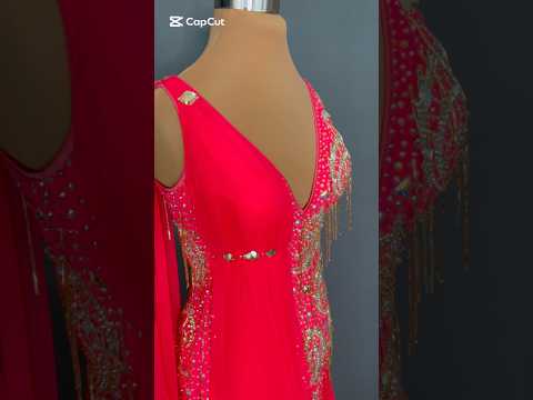 Soft and flowing, this exquisite Smooth dance dress is crafted from bright red supple stretch lycra and luxurious georgette. The fitted silhouette is adorned with golden lace appliqués, richly decorated with bright crystals and beads for a radiant, eye-catching effect. A flowing scarf detail drapes elegantly along the bodice, creating soft, continuous movement as you dance.