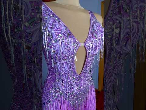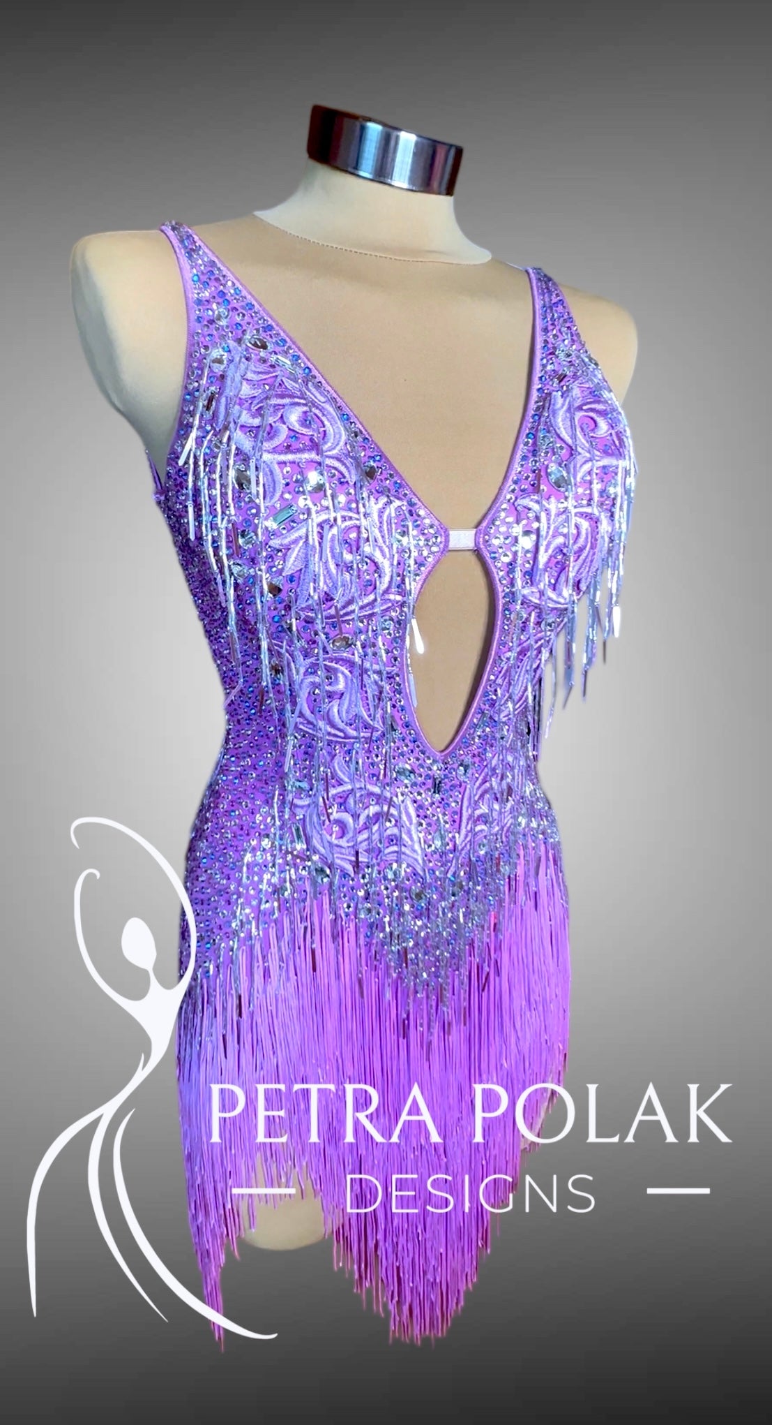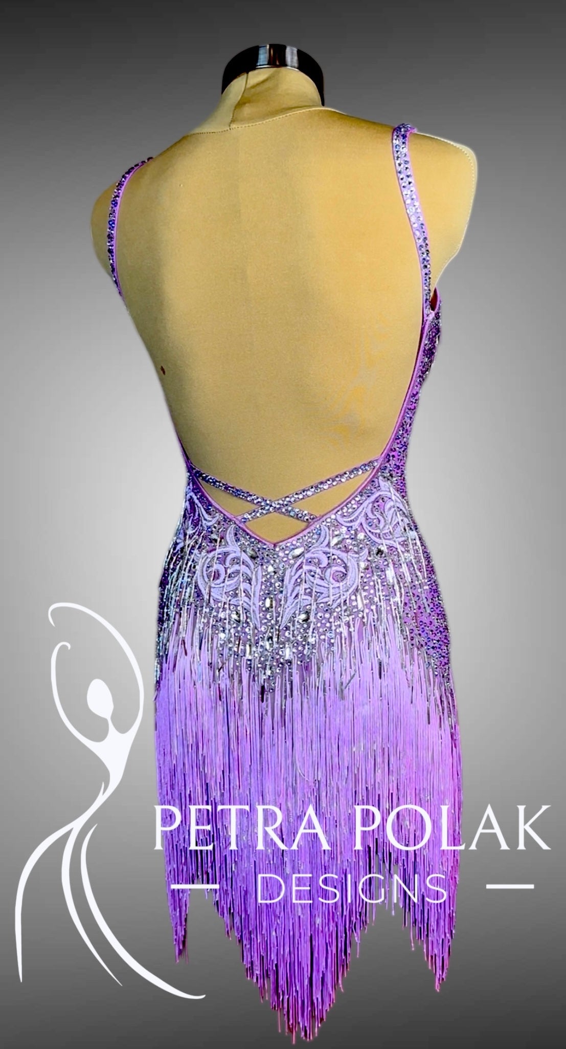 A vision of elegance, this stunning lilac dress enchants with its soft color and graceful silhouette, and it is ready to be delivered to you! This one-of-a-kind design features luxurious lilac lycra and a fringe skirt that adds volume to your movement. Matching lace appliqué is incorporated into the top portion of the dress and is generously adorned with silver and lilac crystals and beads.