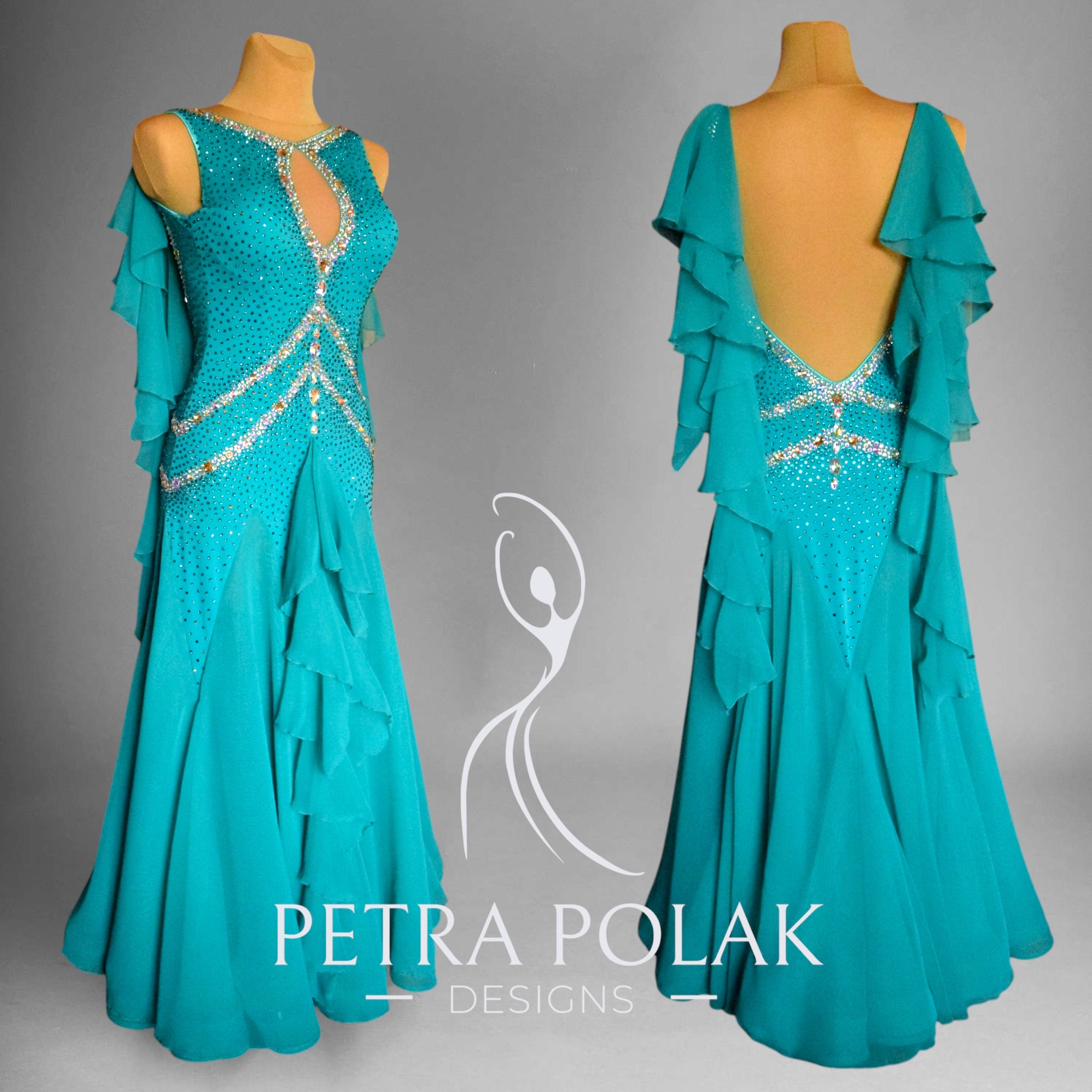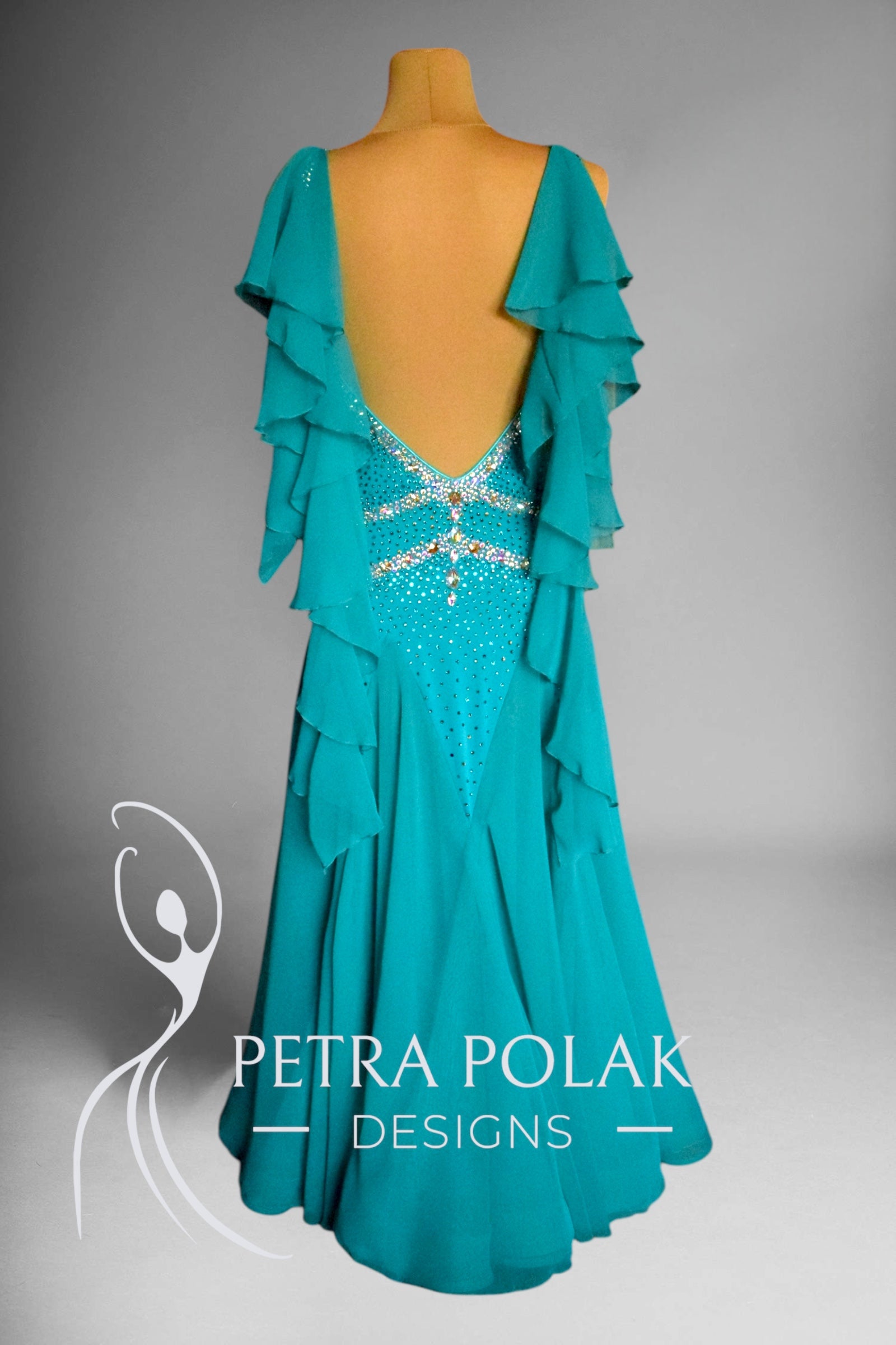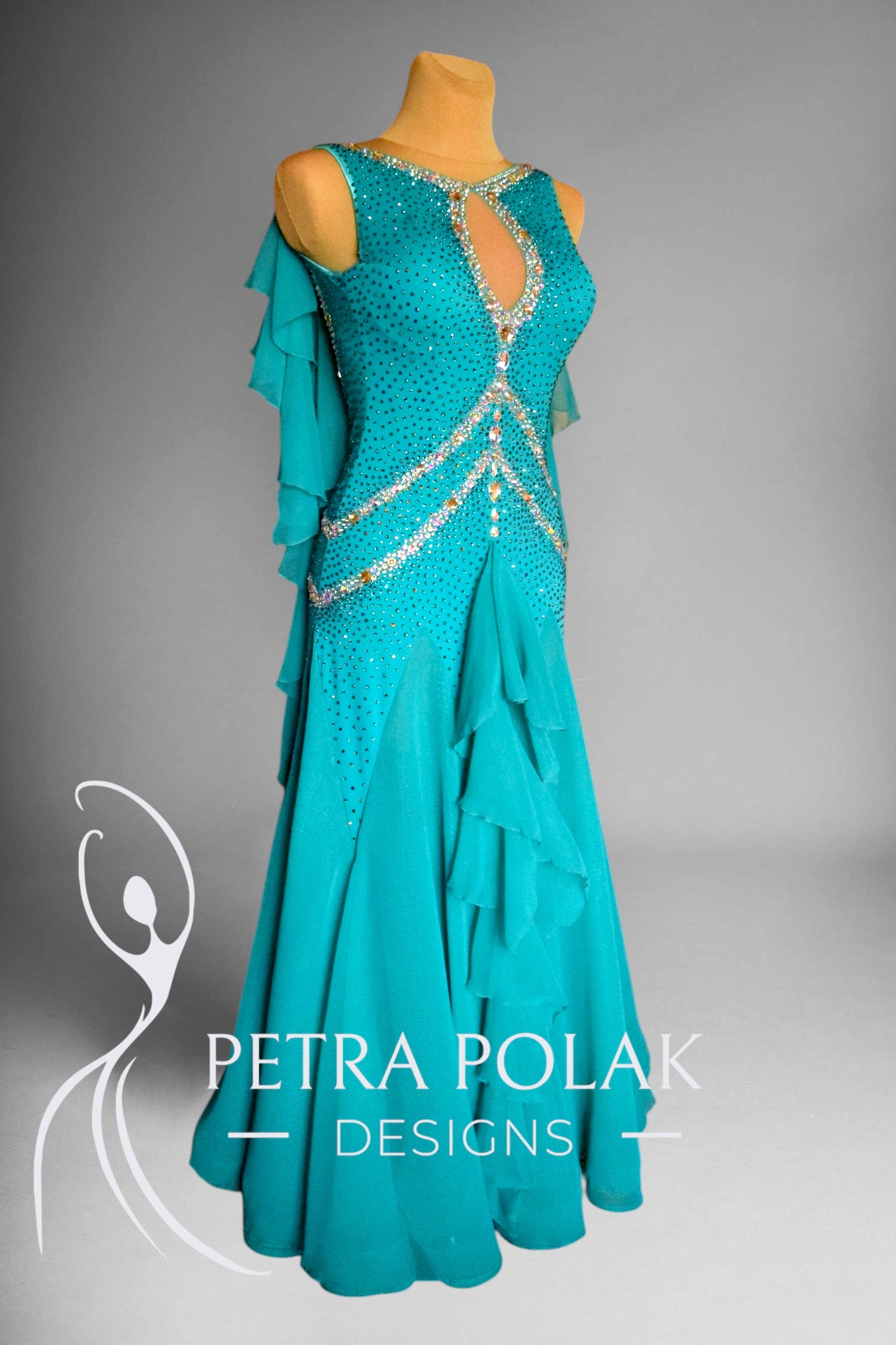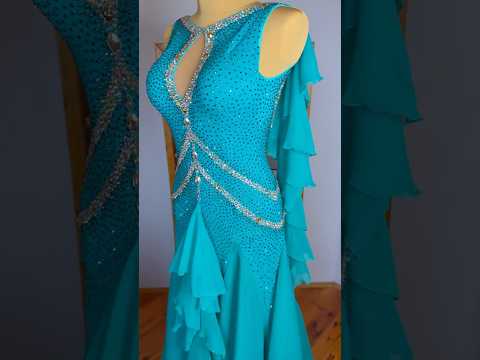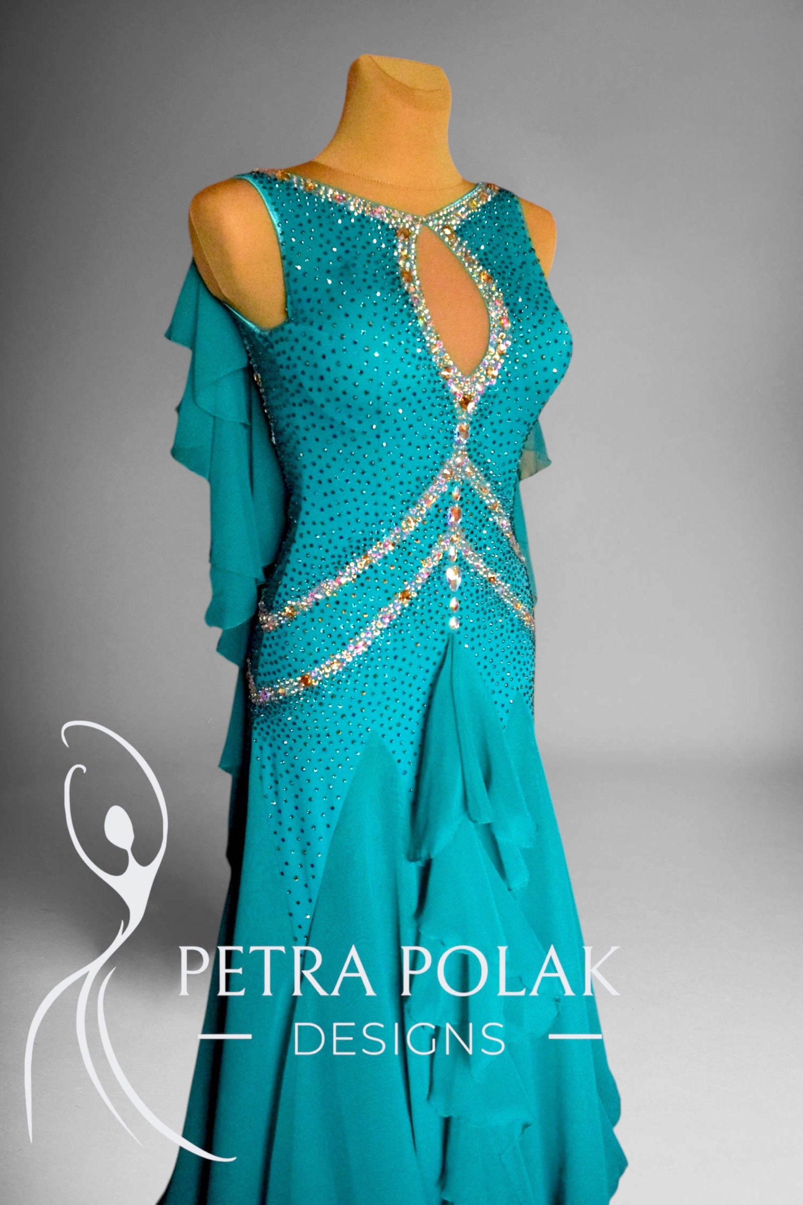 Soft and flowing, this exquisite Smooth dance dress is crafted from supple stretch lycra and luxurious georgette. The fitted silhouette beautifully highlights the waist and bust, enhanced with hundreds of brightly colored crystals that deliver radiant sparkle under the lights. The skirt glides effortlessly with every movement, featuring a soft chiffon ruffle along the back and the front of the skirt that adds graceful volume and fluidity.