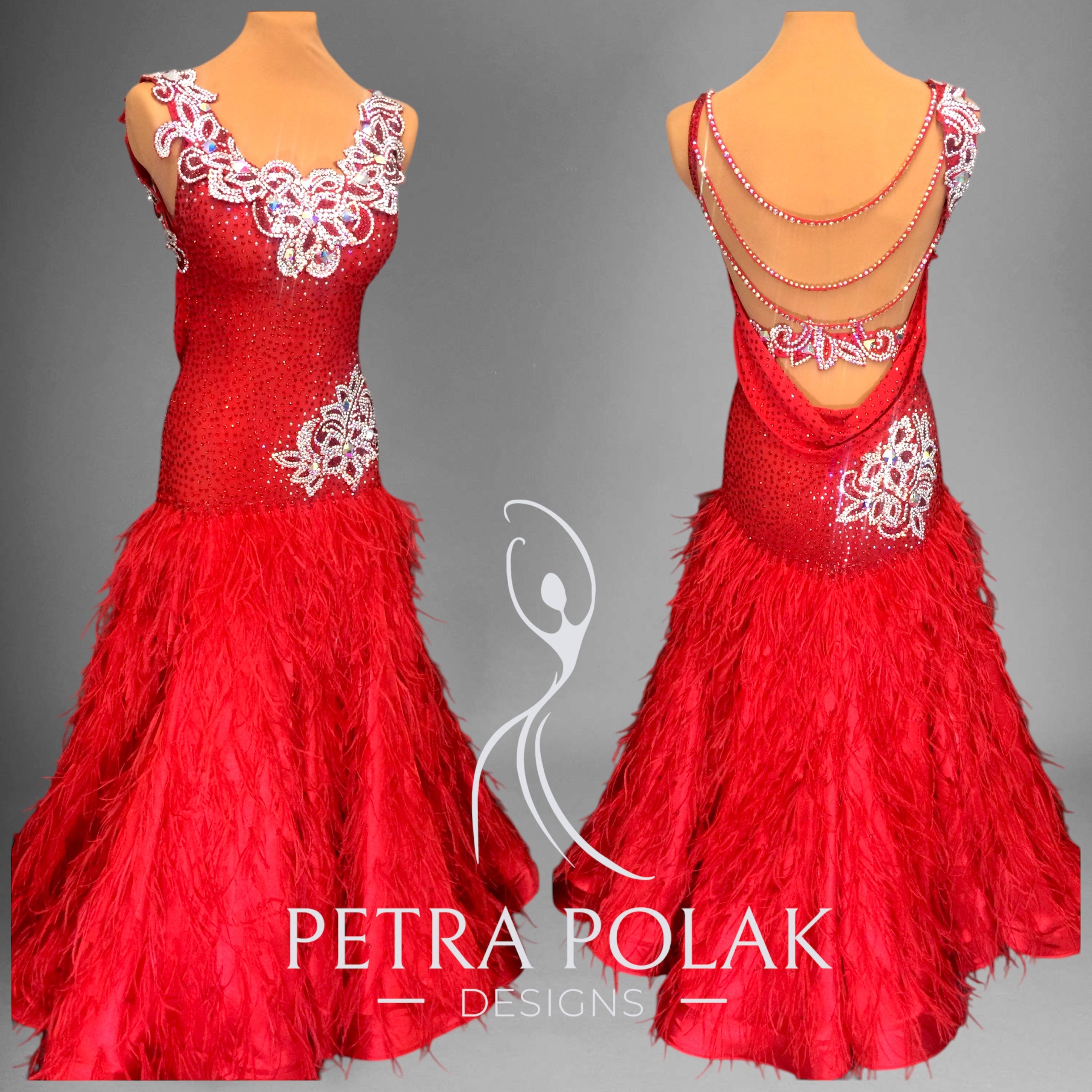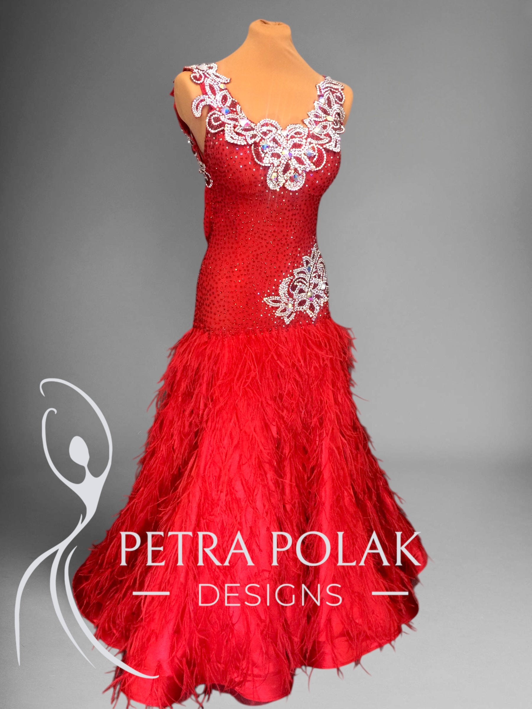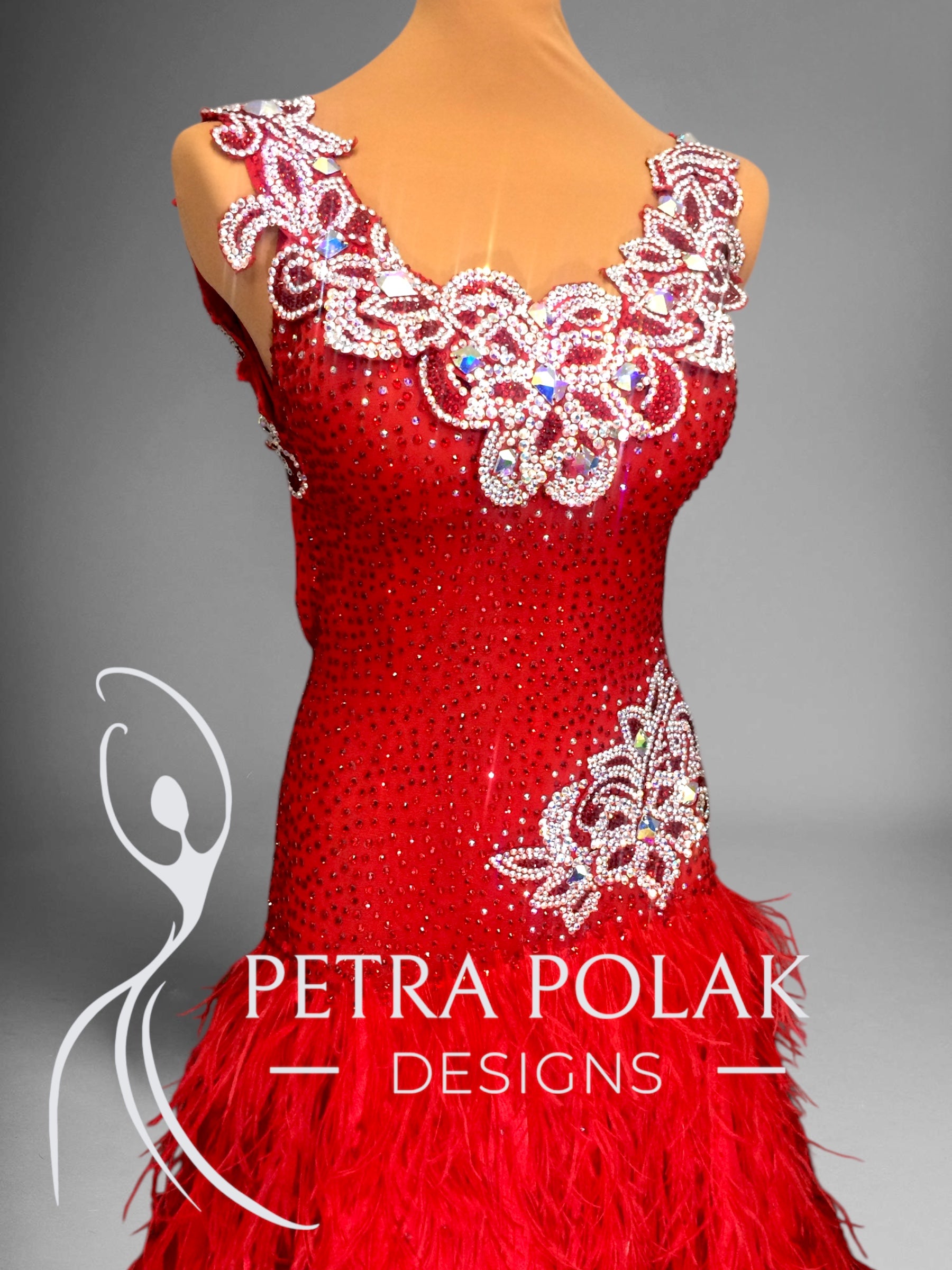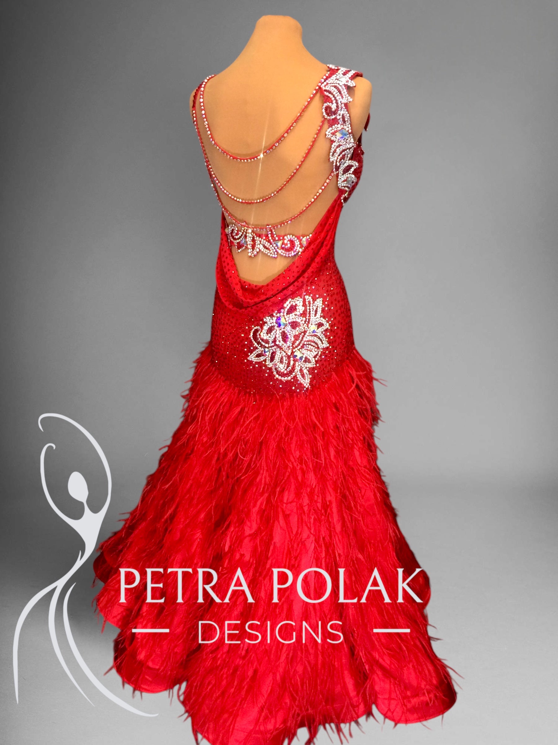 The flowing skirt includes a full layer of satin for stunning movement, topped with clusters of luxurious ostrich feathers that add drama and texture. A red organza underskirt provides additional volume and ensures the skirt moves gracefully with every step.
