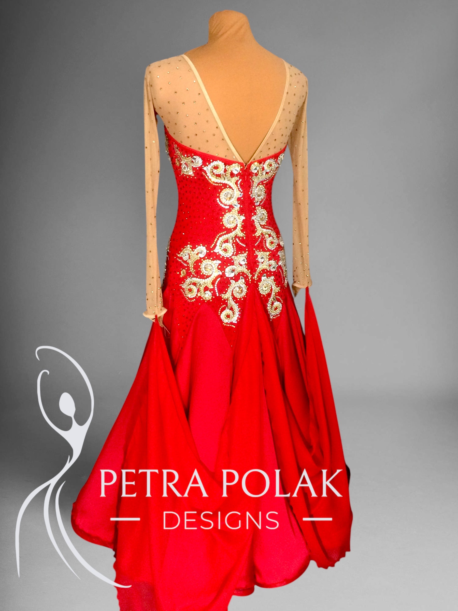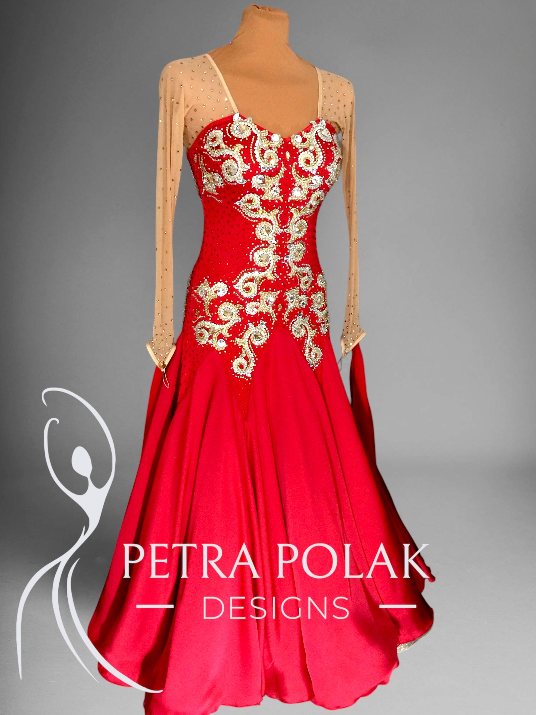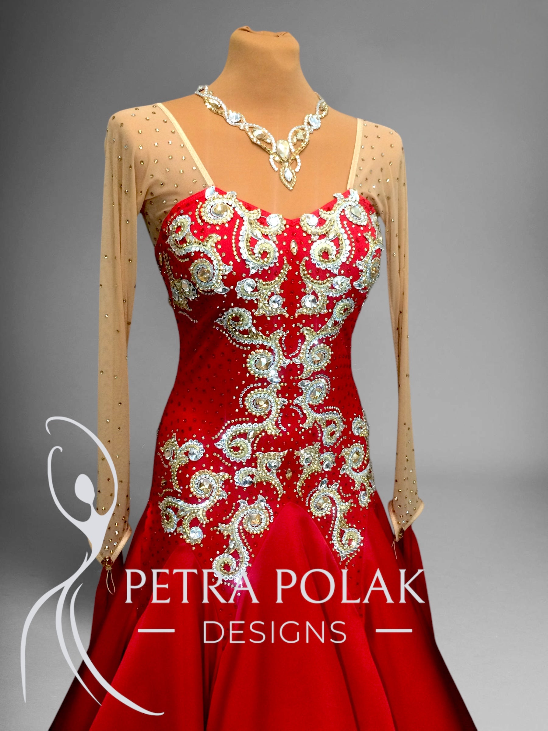 Elegant and timeless, this stunning Standard dance dress is beautifully crafted from soft stretch lycra and luxurious satin. The fitted bodice is adorned with decorative appliqués and richly embellished with hundreds of brightly colored crystals and beads. The sleeves, made from delicate nude mesh, are finished with golden crystals that add subtle shimmer with every movement.